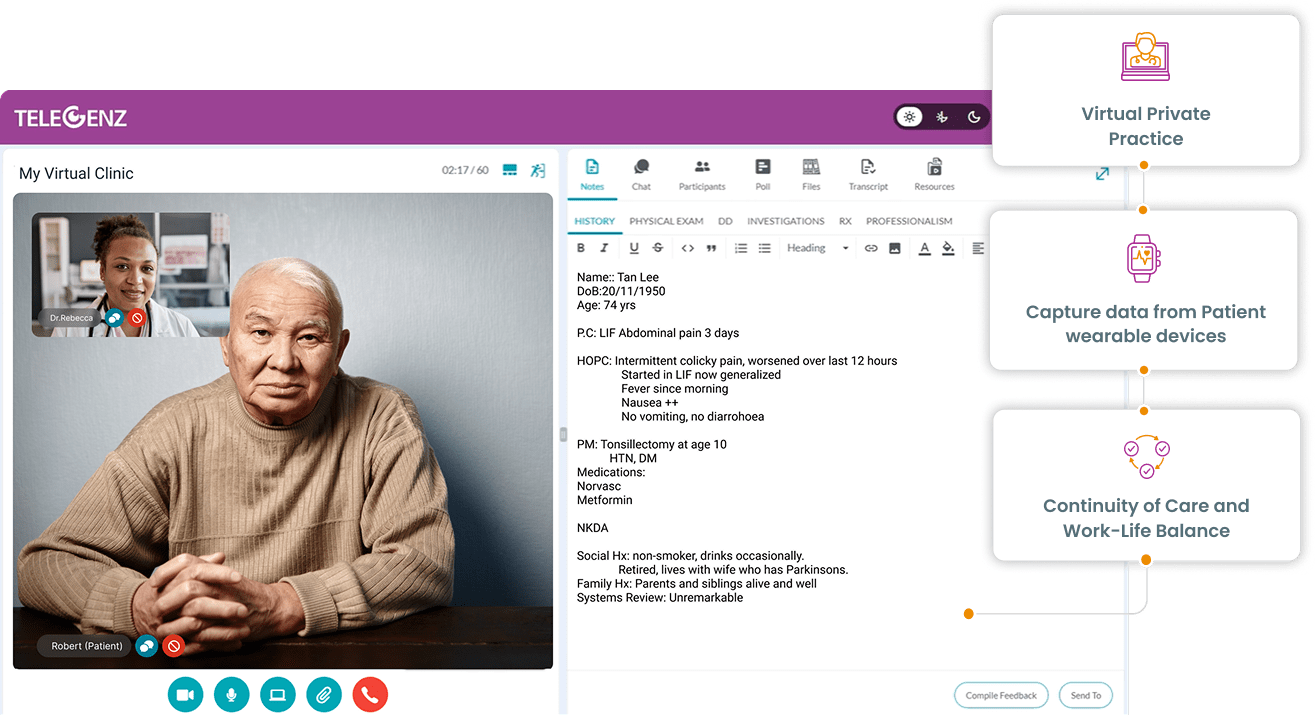 And because My Virtual Clinic is part of the Telegenz ecosystem, all session data including notes, transcriptions, and resources is stored securely for over a year. This makes it easy for practitioners and patients to revisit previous conversations, verify treatment paths, or prepare for follow-up consultations. No more searching through emails or disconnected platforms.